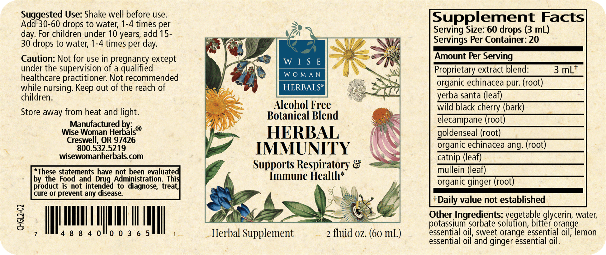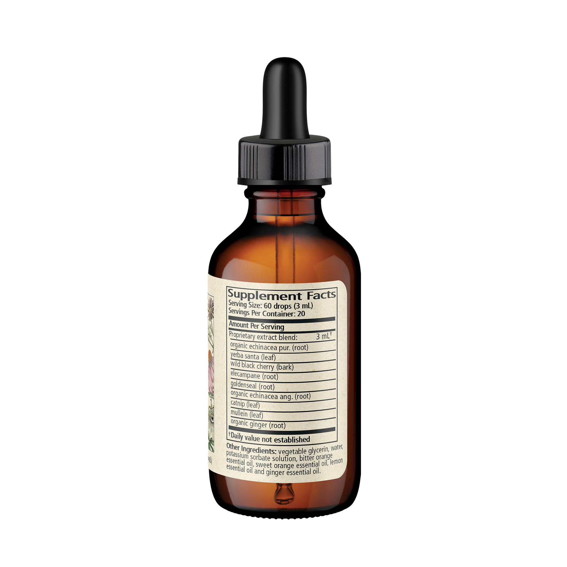 Ingredients: Echinacea pur. (root), yerba santa (leaf), wild black cherry (bark), elecampane (root), goldenseal (root), echinacea ang. (root), catnip (leaf), mullein (leaf), ginger (root), vegetable glycerin, water, potassium sorbate solution, bitter orange essential oil, sweet orange essential oil, lemon essential oil and ginger essential oil.
