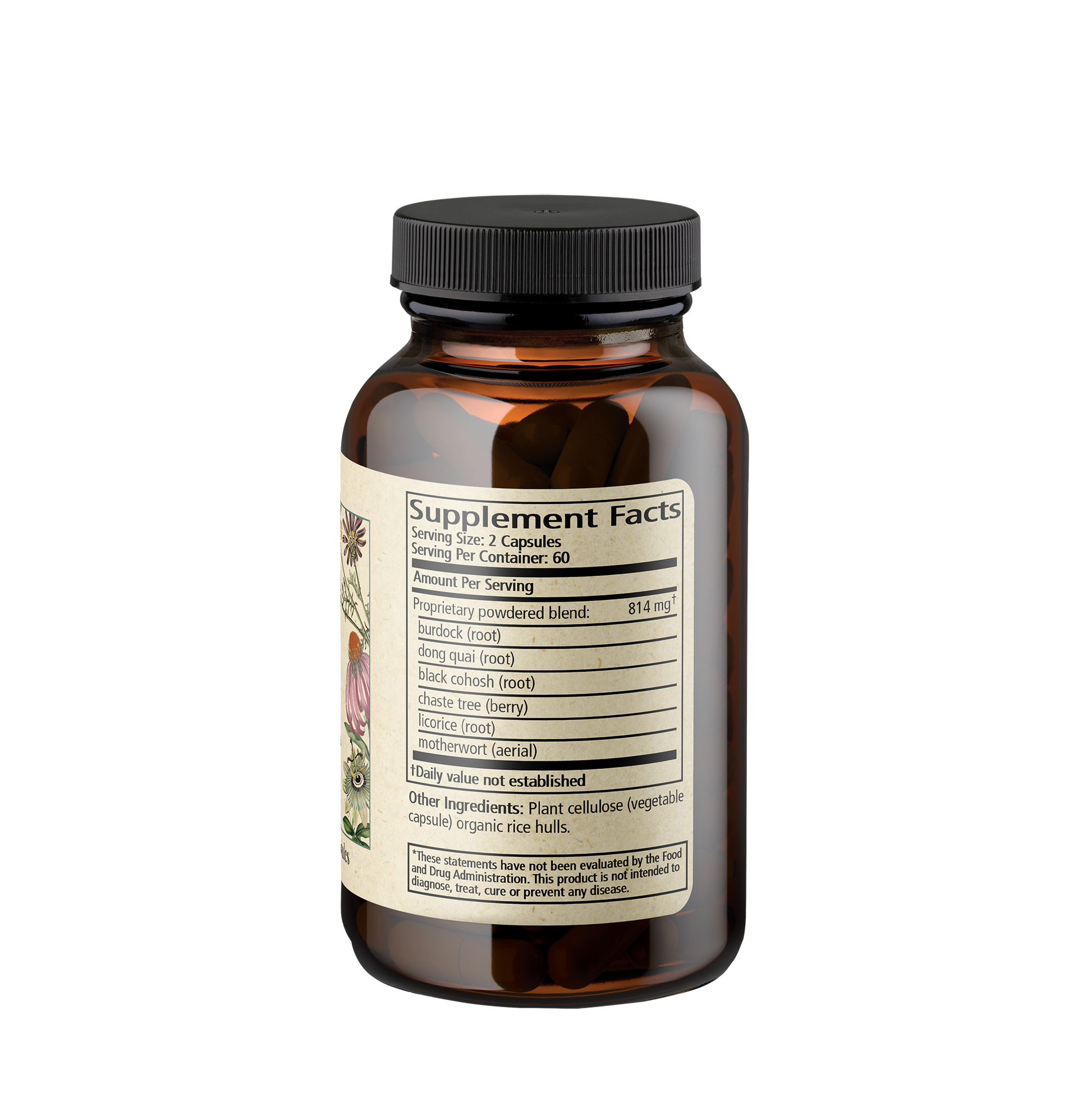 Ingredients: burdock, dong quai, black cohosh, chaste tree, licorice, motherwort and organic rice hulls in 100% vegetarian capsules.